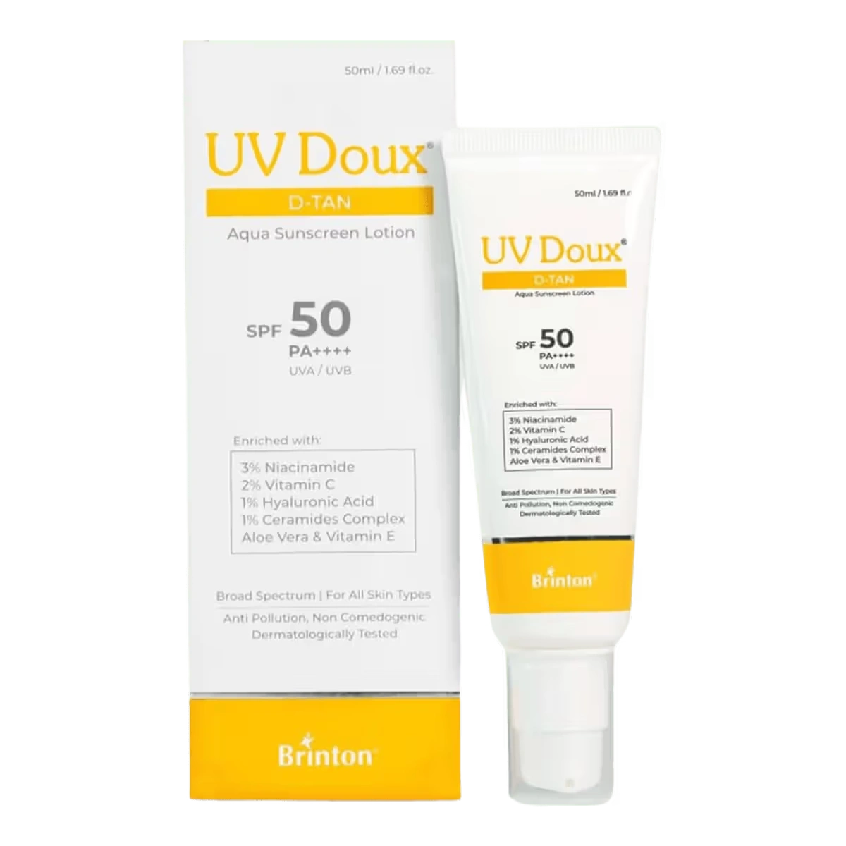 UV Doux D-Tan Aqua Sunscreen Lotion offers advanced SPF 50 PA+++ broad-spectrum protection, effectively shielding the skin from UVA and UVB rays to prevent tanning, sunburn, and early signs of photoaging caused by daily sun exposure.