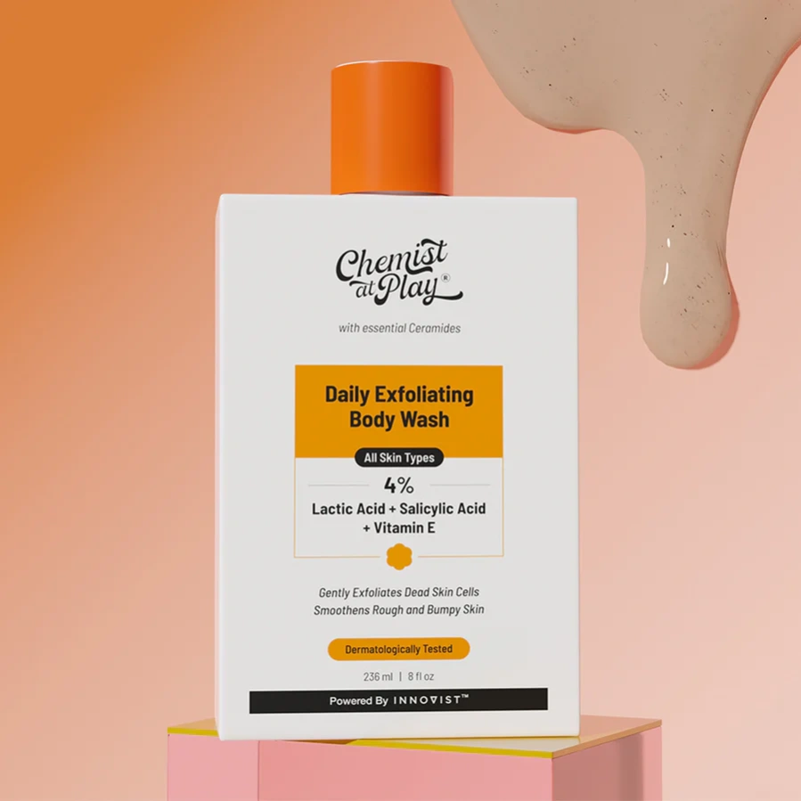 The Chemist At Play Exfoliating Body Wash is a gentle yet effective solution for dull, rough, or bumpy skin. Powered with 1% Salicylic Acid, 2% Lactic Acid, Ceramides, Vitamin E and Murumuru Butter, this body wash for women & men exfoliates dead skin, unclogs pores, fades tan and leaves your skin soft and hydrated. Whether you're dealing with strawberry legs, body acne, or sun-induced dullness, this tan removal body wash offers visible results with every wash.