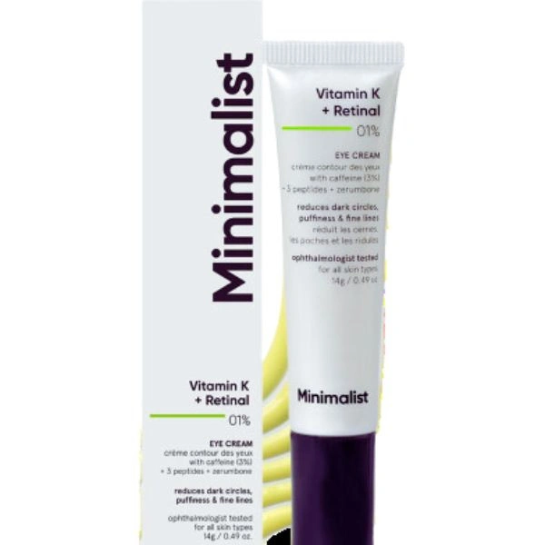Minimalist Vitamin K + Retinal 0.1% Under Eye Cream is a targeted skincare treatment designed to reduce dark circles, under-eye puffiness, and fine lines. Infused with Vitamin K, it strengthens capillaries and reduces discoloration, while 0.1% Retinal (a potent form of Vitamin A) boosts collagen production for firmer, smoother skin. The lightweight, fast-absorbing formula is enriched with skin-soothing ingredients like Centella Asiatica and peptides, making it suitable for all skin types, including sensitive skin.